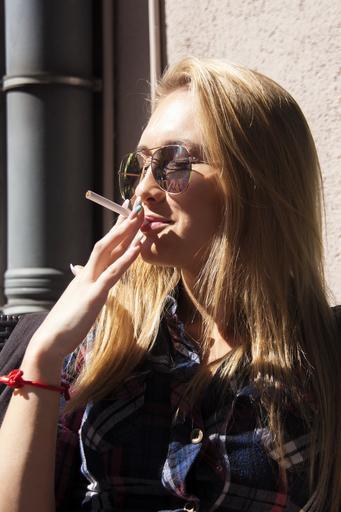 Keywords: blonde girl smoking enjoying sun sunglasses style cool casual accessory woman hair female young portrait face attractive relaxing break cigarette addiction