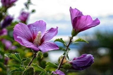 Keywords: blossom bloom hibiscus marshmallow mallow flower red pink close bush purple pink