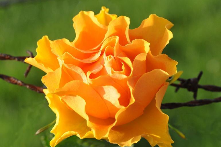 Keywords: blossom bloom orange flower barbed wire close plant nature flora bright summer