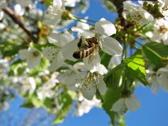 Keywords: blossom blossoms cherry tree bee spring blue sky colors green blue insect