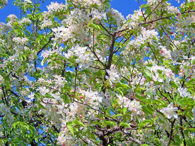 Keywords: blossoms flowers white cherry japanese trees branches green leaves spring blue sky blue background floral blooms blooming buds shoots nature outdoors ornamental flowering plants landscaping