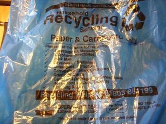 Keywords: Blue bag is blue.JPG en A blue rubbish bag cardboard and paper for the recycling of Own Totnesmartin 2009-08-03 Recycling in England Kerbside collection South Hams