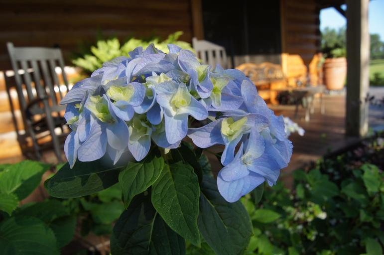 Keywords: blue flower porch hydrangea summer floral green blossom botanical rural outdoors natural garden countryside