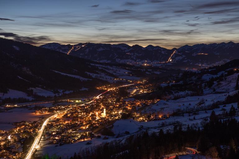 Keywords: blue hour night photograph winter mountains bad hindelang wellnesshotel allgäu lights road evening long exposure night sky mood