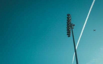 Keywords: blue sky airplane contrails travel transportation lamp posts