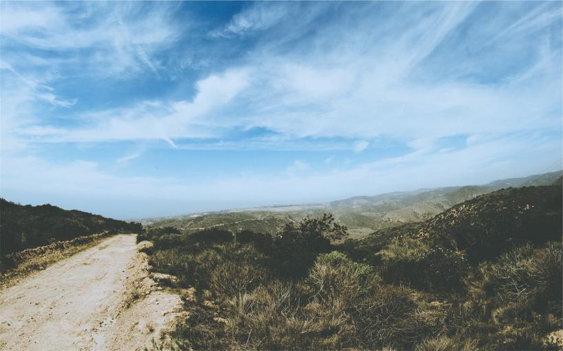 Keywords: blue sky clouds country road bushes grass hills mountains nature
