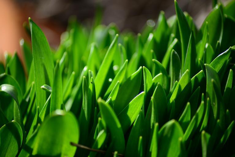 Keywords: bluebell spring new growth cultivated bluebell hyacinthoides hispanica spanish bluebell green leaves bulb leaf close-up garden
