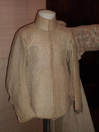 | Keywords: BLW Man's Doublet.jpg Man's Doublet<br /> 1635-40<br /> Glazed linen embroidered with linen thread<br /> Made in England<br /> <br /> Linen was normally used for linings or underwear However the elaborate embroidery and buttons on the doublet indicate that it was formal dress The light colour of the fabric suggests summer wear The seams on each sleeve and at the back were left open to let the short show through A pair of breeches in matching fabric would have been worn with this doublet with a cape to complete the gentleman's outfit <br /> <br /> The linen has not been dyed but bleached and glazed instead to give a uniform colour and a firm texture on which to embroider Back stitch French knots and couching in fine linen thread comprise a pattern of geometric and floral motifs Linen thread hand plaited and sewn over a wooden core in a technique known as passementerie forms the decorative buttons Adam Morgan Victoria and Albert Museum http //www vam ac uk/ 177-1900 http //collections vam ac uk/item/O77444/doublet/ PD Doublet clothing 17th-century textiles Clothing in the Victoria and Albert Museum 1630s fashion |