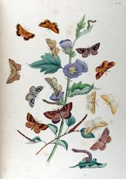 | Keywords: BMAT.II-62.jpg en Althaea officinalis Bradyepetes amataria; Epione apiciaria; Epione vespertaria; Epione advenaria; Eurymene dolabraria; Aspilates citraria; Aspilates gilvaria; Aspilates respersaria; Phasiane plumbaria; Larentia cervinaria; Larentia chenopodiaria; Larentia bipunctaria; Larentia multistrigaria Plate 62 1845 British Moths and their Transformations Volume II 1845 http //caliban mpiz-koeln mpg de/westwood/moths2/high/IMG_3666 html Henry Noel Humphreys and John Obadiah Westwood PD-old Uploaded with UploadWizard British Moths and their Transformations Volume II |