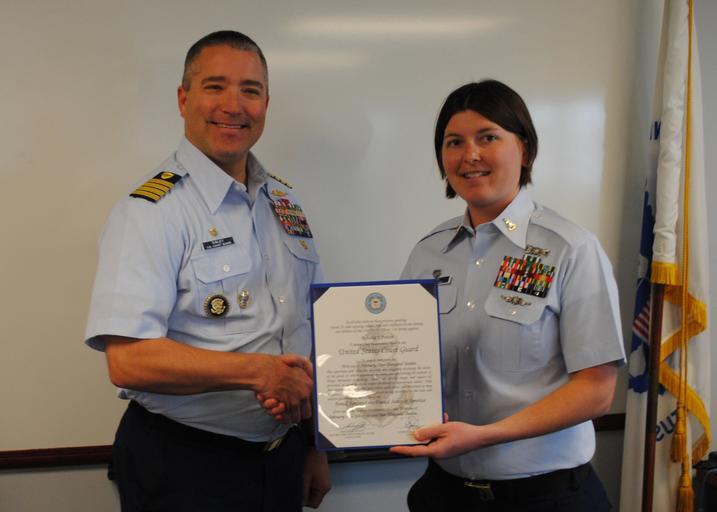 | Keywords: BMCS Polzin advancement DVIDS1113743.jpg en MICHIGAN CITY Ind - Capt Matthew Sibley left commander of Coast Guard Sector Lake Michigan in Milwaukee Wis congratulates Rebecca Polzin a native of Preston Minn and officer-in-charge of Coast Guard Station Michigan City Ind after her advancement to senior chief petty officer Feb 1 2012 As officer-in-charge Polzin ensures the 19 enlisted active duty members and 7 enlisted Coast Guard reservists at Station Michigan City carry out their missions of search and rescue; maritime law enforcement; ports waterways and coastal security; and marine environmental protection U S Coast Guard photo by Seaman Kody Felthoff 2012-02-01 https //www dvidshub net/image/1113743 1113743 2013-12-12 18 00 MICHIGAN CITY IN US PD-USGov Coast Guard Station Michigan City Lake Michigan Images from DoD uploaded by Fæ |