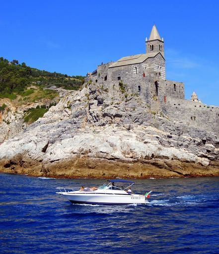 Keywords: boat castle cliff sea church costa rock porto venere liguria italy rocks speedboat