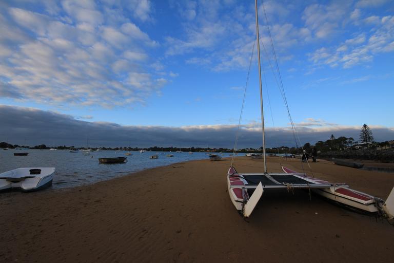 Keywords: boat sunrise water outdoor sea sky clouds ocean horizon sand beach