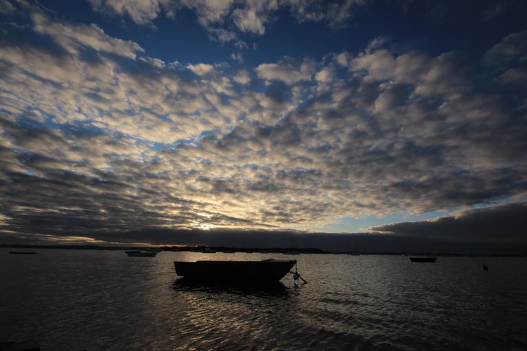 Keywords: boat sunrise water outdoor sea sky clouds ocean horizon sand beach