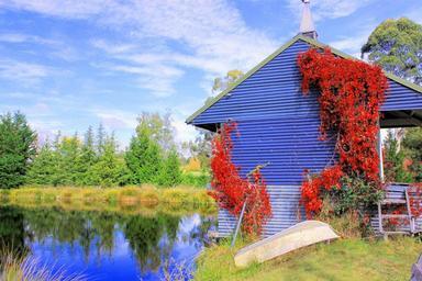 Keywords: boathouse scenic landscape autumn lake nelson south island new zealand blue water