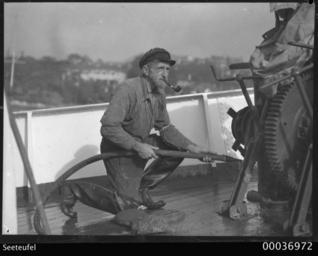 | Keywords: hood collection hoodcollection samuel j hood collection samueljhoodcollection sam hood samhood samuel j hood studio collection samueljhoodstudiocollection hood count felix graf von luckner countfelixgrafvonluckner count von luckner countvonluckner von luckner vonluckner seeteufel sydney sydney harbour sydneyharbour neutral bay neutralbay kirribilli kurraba point kurrabapoint auxiliary cruiser auxiliarycruiser schooner german crew boatswain karl muller karlmuller blackandwhite monochrome black and white This photograph depicts the boatswain of SEETEUFEL, Karl Muller, smoking a pipe and hosing the vessel's deck, during Count Felix Graf von Luckner's visit to Sydney in May 1938. According to the secret files kept on the von Luckners by the Commonwealth Investigation Branch (CIB), Muller was: ‘afraid to go ashore because he cannot resist the city hotels and as he is 62 years of age cannot stand up to hard drinking.' These files are held within the National Archives of Australia.  For more information on Count von Luckner's visit see our blog post 'Espionage and paranoia: The Sea Devil tours Australia'.  This photo is part of the Australian National Maritime Museum’s Samuel J. Hood Studio collection. Sam Hood (1872-1953) was a Sydney photographer with a passion for ships. His 60-year career spanned the romantic age of sail and two world wars. The photos in the collection were taken mainly in Sydney and Newcastle during the first half of the 20th century.   The ANMM undertakes research and accepts public comments that enhance the information we hold about images in our collection. This record has been updated accordingly.   Photographer: Samuel J. Hood Studio Collection  Object no. 00036972 This photograph depicts the boatswain of SEETEUFEL, Karl Muller, smoking a pipe and hosing the vessel's deck, during Count Felix Graf von Luckner's visit to Sydney in May 1938. According to the secret files kept on the von Luckners by the Commonwealth Investigation Branch (CIB), Muller was: ‘afraid to go ashore because he cannot resist the city hotels and as he is 62 years of age cannot stand up to hard drinking.' These files are held within the National Archives of Australia.  For more information on Count von Luckner's visit see our blog post 'Espionage and paranoia: The Sea Devil tours Australia'.  This photo is part of the Australian National Maritime Museum’s Samuel J. Hood Studio collection. Sam Hood (1872-1953) was a Sydney photographer with a passion for ships. His 60-year career spanned the romantic age of sail and two world wars. The photos in the collection were taken mainly in Sydney and Newcastle during the first half of the 20th century.   The ANMM undertakes research and accepts public comments that enhance the information we hold about images in our collection. This record has been updated accordingly.   Photographer: Samuel J. Hood Studio Collection  Object no. 00036972 |