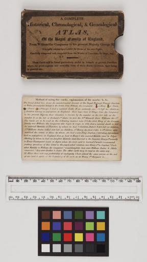 Keywords: Bodleian Libraries, Complete historical, chronological, & geneaological atlas, of the Royal Family of England, from William the Conqueror to his present Majesty George 3rd.jpg Game entitled A complete historical chronological geneaological atlas of the Royal Family of England from William the Conqueror to his present Majesty George 3rd; originally selected by a lady for the use of her own pupils 12 cards in slip case; Method of using the cards explanation of the marks c c ; Family of Rollow of Normandy reigned 69 years gave 3 kings 1 ; Family of Anjou or Plantagenet reigns 331 years gives 14 kings 2 ; Family of Plantagenet continued 3 ; Branch of Lancaster or Red Rose 4 ; Genealogy of Henry the 7th from John Beauford second son of John of Gaunt 5 ; House of York from Edmond 4th son of Edward 3rd to Elizabeth who married Henry 6 ; Family of Richard Duke of York brothers and sisters to Edward 4th 7 ; Family of Tudor reigns 118 years gives 5 sovereigns 8 ; Genealogy of James the 1st 9 ; Descendants of Charles the first 10 ; untitled Elizabeth daughter of James the 1st married Frederick the 5th elector Palantine had one daughter 11 ; Image 2 slip case 12p ; 78 x 118 x 6 mm exhibition history Allegro identifier 20040903/15 08 17 jl object history object type <gallery> File Bodleian Libraries Complete historical chronological geneaological atlas of the Royal Family of England from William the Conqueror to his present Majesty George 3rd 101 jpg </gallery> Licensed-PD-Art PD-old-100 cc-by-4 0 place of creation place of discovery http //digital bodleian ox ac uk/inquire/p//1ff3611a-d4a8-4e7e-bb55-ab5512cc6308 Digital Bodleian Template John Johnson Complete historical chronological geneaological atlas of the Royal Family of England from William the Conqueror to his present Majesty George 3rd Uploaded with GWToolset Bodleian Libraries Complete historical chronological geneaological atlas of the Royal Family of England from William the Conqueror to his present Majesty George 3rd http //iiif bodleian ox ac uk/iiif/image/2532a476-2f4c-4676-85ca-1ed83e0dc6d9/full/ 1000 1000/0/default jpg Files uploaded by the Bodleian Libraries' Wikimedian In Residence Educational games Kings