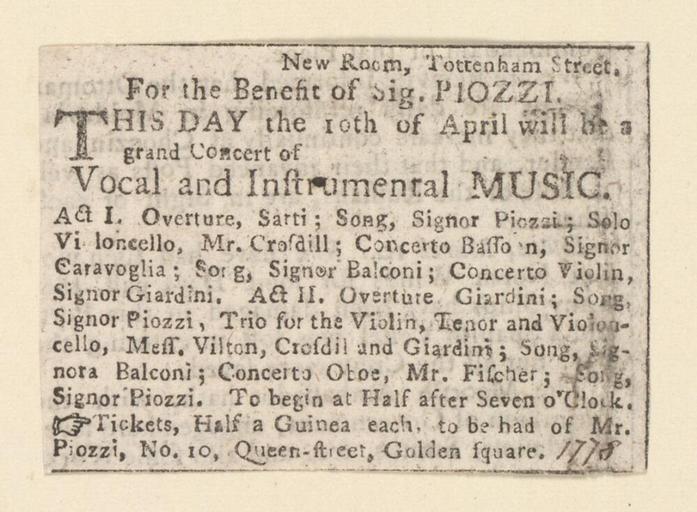 Keywords: Bodleian Libraries, For the benefit of Sig. Piozzi.jpg Newscutting relating to the New Rooms 10th April 1778 announcing Concert in two acts for the benefit of Sig Piozzi; Concert in two acts; For the benefit of Sig Piozzi single sheet; 44 x 62 mm exhibition history This day the 10th April will be a grand concert of vocal and instrumental music Allegro identifier 20030603/14 48 08 hm object history object type Licensed-PD-Art PD-old-100 cc-by-4 0 place of creation place of discovery http //digital bodleian ox ac uk/inquire/p//5e146eda-b16f-4179-93d3-9d0b4b6c6ca1 Digital Bodleian Template John Johnson For the benefit of Sig Piozzi Uploaded with GWToolset Bodleian Libraries For the benefit of Sig Piozzi http //iiif bodleian ox ac uk/iiif/image/5e146eda-b16f-4179-93d3-9d0b4b6c6ca1/full/ 1000 1000/0/default jpg Files uploaded by the Bodleian Libraries' Wikimedian In Residence Concerts in London Singing Instrumental music Clippings |