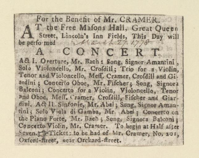 Keywords: Bodleian Libraries, For the benefit of Mr. Cramer.jpg Newscutting relating to Free Mason's Hall March 28 1778 announcing A concert for the benefit of Mr Cramer; Concert; For the benefit of Mr Cramer single sheet; 49 x 64 mm exhibition history At the Free Mason's Hall Great Queen Street Lincoln's Inn Fields this day will be performed a concert Allegro identifier 20030604/16 26 25 hm object history object type Licensed-PD-Art PD-old-100 cc-by-4 0 place of creation place of discovery http //digital bodleian ox ac uk/inquire/p//cb920a6a-b53f-47fe-a722-52564b8dafa8 Digital Bodleian Template John Johnson For the benefit of Mr Cramer Uploaded with GWToolset Bodleian Libraries For the benefit of Mr Cramer http //iiif bodleian ox ac uk/iiif/image/cb920a6a-b53f-47fe-a722-52564b8dafa8/full/ 1000 1000/0/default jpg Files uploaded by the Bodleian Libraries' Wikimedian In Residence Concerts in London Singing Instrumental music Violins Oboes Cellos Clippings |