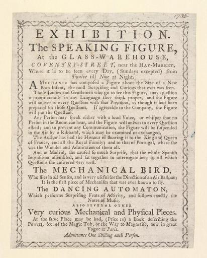Keywords: Bodleian Libraries, Handbill of Glass-warehouse, 1785.jpg Handbill of Glass-warehouse 1785 ; Exhibition The speaking figure at the Glass-warehouse Coventry-Street near the Hay-market where it is to be seen every day Sundays excepted a mechanic has composed a figure about the size of a new born infant ; Handbill of Glass-warehouse 1785 single sheet; 197 x 154 mm exhibition history 003401; t192527 object history object type Licensed-PD-Art PD-old-100 cc-by-4 0 place of creation place of discovery http //digital bodleian ox ac uk/inquire/p//f65a82ee-0760-49bb-b354-bbe8af7d6072 Digital Bodleian Template John Johnson Handbill of Glass-warehouse 1785 Uploaded with GWToolset Bodleian Libraries Handbill of Glass-warehouse 1785 http //iiif bodleian ox ac uk/iiif/image/f65a82ee-0760-49bb-b354-bbe8af7d6072/full/ 1000 1000/0/default jpg Files uploaded by the Bodleian Libraries' Wikimedian In Residence Mechanical dolls Infants Dance ephemera Mechanical toys Exhibitions |