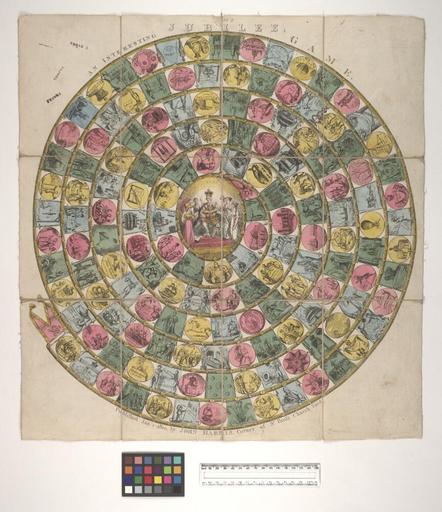Keywords: Bodleian Libraries, Jubilee. A new and interesting game.jpg Game of 1810 entitled The jubilee A new and interesting game; game has 150 squares representing events in the reign of George III some just pictorial others with some text Mounted on linen and folded in original slip case with hand-coloured label Johnson copy of the board has stamped letters at top left Tynyr L ; War with Spain; Ich dien; Peace; Duke of York born; Duke of Clarence born; Stamps; First meeting of Congress at New York; Princess Charlotte Augusta Matilda; Duke of Kent born; Hyder Ali's fleet taken; Princess Augusta Sophia; Princess Elizabeth; Prince Ernest; Mr Bruce discovers the Nile; Duke of Sussex 1773; King reviews the fleet; Duke of Cambridge; Princess Sophia born; Earl of Chatham; Prince Octavius; Admiral Rodney victory; No popery riots in London; Prince Alfred born Died; Gibraltar; Quis separabit MDCCLXXXIII; Peace; Handel; Commerce with France Commercial treaty; Botany Bay; Kings alarming illness; General thanksgiving for the recovery of his Majesty; Convention between Great Britain and Spain; Riots at Birmingham; War commences between Britain and France; Magna Charta; Valenciennes retaken; Spain declare war; Mutiny; Erin Gobrah Rebellion in Ireland; Defeat at ; Dutch fleet surrender in the ; Bread prohibeted sic till it had been baked 24 hours; Embargo; Peace proclamed; War declared against France; Hanover taken by the French; Bank of England 1804 ; Trafalgar; Abolition of the slave trade; Laying the foundation of Downing College Cambridge; Danish navy; 12 000 Spanish troups; Sir John Moore Aug 17 1809; Vaccine estabishm Jan 16 1808; Colin Wardle Mrs Claridge ; Duke of York resigns his office; Jubilee; Image 2 slip case single sheet; 195 x 138 x 8 slip case mm; 557 x 532 board mm exhibition history Allegro identifier 20030929/18 39 37 jl object history object type Licensed-PD-Art PD-old-100 cc-by-4 0 place of creation London England John Harris place of discovery http //digital bodleian ox ac uk/inquire/p//fc074cd3-9397-4736-8dec-a9769b57bd87 Digital Bodleian Template John Johnson Jubilee A new and interesting game Uploaded with GWToolset Bodleian Libraries Jubilee A new and interesting game http //iiif bodleian ox ac uk/iiif/image/5ead8da3-b69f-4127-bb05-ff8883e4670c/full/ 1000 1000/0/default jpg Files uploaded by the Bodleian Libraries' Wikimedian In Residence Game boards Great Britain History--1789-1820 George |
