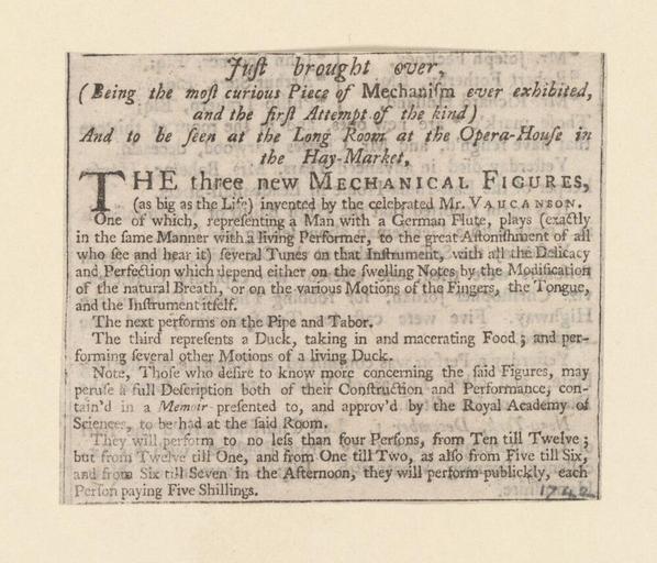 | Keywords: Bodleian Libraries, Just brought over, (being the most curious piece of mechanism ever exhibited, and the first attempt of the kind) and to be seen at the Long Room at the Opera House in the Hay-market.jpg Newscutting relating to the Long Room 1742 announcing mechanical musical instruments and other mechanical exhibits; 1742 manuscript ; Man with a German flute; Man playing the pipe and tabor; Duck; Just brought over being the most curious piece of mechanism ever exhibited and the first attempt of the kind and to be seen at the Long Room at the Opera House in the Hay-market single sheet; 68 x 82 mm exhibition history Three new mechanical figures as big as the life invented by the celebrated Mr Vauncanson One of which representing a man Allegro identifier 20030523/11 16 54 hm object history object type Licensed-PD-Art PD-old-100 cc-by-4 0 place of creation place of discovery http //digital bodleian ox ac uk/inquire/p//64d14536-6073-4e3f-9422-68a679454be0 Digital Bodleian Template John Johnson Just brought over being the most curious piece of mechanism ever exhibited and the first attempt of the kind and to be seen at the Long Room at the Opera House in the Hay-market Uploaded with GWToolset Bodleian Libraries Just brought over being the most curious piece of mechanism ever exhibited and the first attempt of the kind and to be seen at the Long Room at the Opera House in the Hay-market http //iiif bodleian ox ac uk/iiif/image/64d14536-6073-4e3f-9422-68a679454be0/full/ 1000 1000/0/default jpg Files uploaded by the Bodleian Libraries' Wikimedian In Residence Musical instruments Exhibitions Mechanical toys Pipes Tabor Robots Clippings automata |