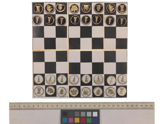 Keywords: Bodleian Libraries, Kronheim & Co.'s pocket chess box containing Chessmen, draughtmen and board.jpg Game entitled Kronheim Co 's pocket chess box containing Chessmen draughtsmen and board; has folding chess board The following pieces are embossed in gold onto white disks 8 pawns 2 knights horses 2 rooks castles 2 bishops mitres 1 queen crown 1 king different crown The following pieces are embossed in gold onto black 8 pawns 2 knights 2 rooks 2 bishops 1 queen 1 king In the Johnson copy the box is slightly damaged; Chess; Draughts; Image 2 box 32 pieces; 82 x 105 x 18 mm exhibition history Allegro identifier 20040903/12 50 28 jl object history object type Licensed-PD-Art PD-old-100 cc-by-4 0 place of creation London England Kronheim Co place of discovery http //digital bodleian ox ac uk/inquire/p//b3c16d69-5a8e-48f0-9273-48ad6c8cbb68 Digital Bodleian Template John Johnson Kronheim Co 's pocket chess box containing Chessmen draughtmen and board Uploaded with GWToolset Bodleian Libraries Kronheim Co 's pocket chess box containing Chessmen draughtmen and board http //iiif bodleian ox ac uk/iiif/image/a1d00249-4323-4c85-8056-aca3d4a69ece/full/ 1000 1000/0/default jpg Files uploaded by the Bodleian Libraries' Wikimedian In Residence Game boards Chess sets |