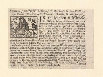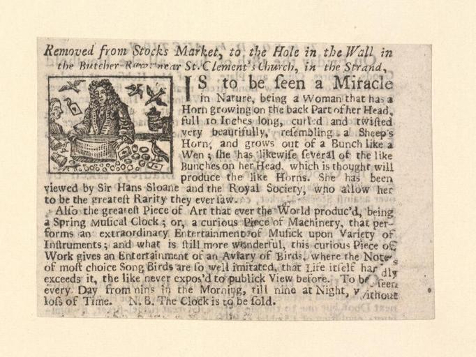 Keywords: Bodleian Libraries, Newscutting relating to Hole in the wall in the Butcher-Row announcing a Woman with horn growing.jpg Newscutting relating to Hole in the wall in the Butcher-Row announcing a Woman with horn growing; Woman with horn growing; Spring musical clock; Newscutting relating to Hole in the wall in the Butcher-Row announcing a Woman with horn growing single sheet; 59 x 85 mm exhibition history Removed from Stocks Market to the hole in the wall in the Butcher-Row near St Clement's Church in the Strand is to be seen a miracle in nature being a woman that has a horn growing on the back part of her head Allegro identifier 20030616/14 59 51 hm object history object type Licensed-PD-Art PD-old-100 cc-by-4 0 place of creation place of discovery http //digital bodleian ox ac uk/inquire/p//5be7fa35-a4e6-44c2-a04b-b9b1f753d45e Digital Bodleian Template John Johnson Newscutting relating to Hole in the wall in the Butcher-Row announcing a Woman with horn growing Uploaded with GWToolset Bodleian Libraries Newscutting relating to Hole in the wall in the Butcher-Row announcing a Woman with horn growing http //iiif bodleian ox ac uk/iiif/image/5be7fa35-a4e6-44c2-a04b-b9b1f753d45e/full/ 1000 1000/0/default jpg Files uploaded by the Bodleian Libraries' Wikimedian In Residence Abnormalities Human Women Horns Mechanical toys Musical instruments Curiosities Exhibitions Clippings Wigs Clothing Equipment Freaks |