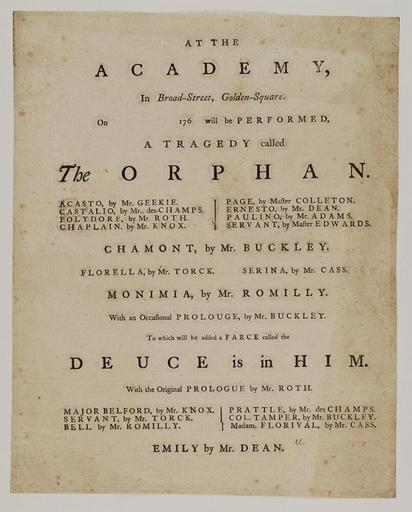 Keywords: Bodleian Libraries, Playbill of The Academy, 176-, announcing The orphan &c..jpg Playbill of The Academy 176- announcing The orphan c ; slightly foxed; Orphan; Deuce is in him; Playbill of The Academy 176- announcing The orphan c single sheet; 255 x 205 mm exhibition history At the Academy in Broad-Street Golden-Square Allegro identifier 20001204/13 16 20 jl object history object type Licensed-PD-Art PD-old-100 cc-by-4 0 place of creation s l England s n place of discovery http //digital bodleian ox ac uk/inquire/p//82b5d857-6d72-4fcc-bf68-a1be081c0f3c Digital Bodleian Template John Johnson Playbill of The Academy 176- announcing The orphan c Uploaded with GWToolset Bodleian Libraries Playbill of The Academy 176- announcing The orphan c http //iiif bodleian ox ac uk/iiif/image/82b5d857-6d72-4fcc-bf68-a1be081c0f3c/full/ 1000 1000/0/default jpg Files uploaded by the Bodleian Libraries' Wikimedian In Residence Playbills Tragedies |