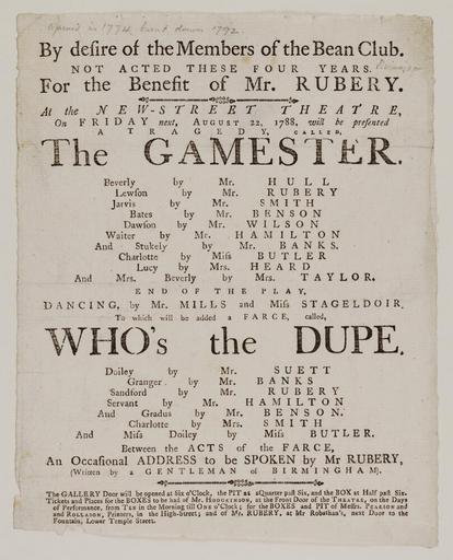 Keywords: Bodleian Libraries, Playbill of New-Street Theatre, Friday, August 22, 1788, announcing The gamester &c..jpg Playbill of New-Street Theatre Friday August 22 1788 announcing The gamester c for the benefit of Mr Rubery; note in pencil at top of bill opened in 1774 burnt down 1792 ; Gamester; Dancing; Who's the dupe; Playbill of New-Street Theatre Friday August 22 1788 announcing The gamester c single sheet; 233 x 187 mm exhibition history By desire of the members of the Bean Club 010897 object history object type Licensed-PD-Art PD-old-100 cc-by-4 0 place of creation Birmingham England place of discovery http //digital bodleian ox ac uk/inquire/p//55f3d613-1e28-441e-8f68-fd480d06ae47 Digital Bodleian Template John Johnson Playbill of New-Street Theatre Friday August 22 1788 announcing The gamester c Uploaded with GWToolset Bodleian Libraries Playbill of New-Street Theatre Friday August 22 1788 announcing The gamester c http //iiif bodleian ox ac uk/iiif/image/55f3d613-1e28-441e-8f68-fd480d06ae47/full/ 1000 1000/0/default jpg Files uploaded by the Bodleian Libraries' Wikimedian In Residence Theater England--Birmingham--History--18th century Playbills Tragedies Bean Club |