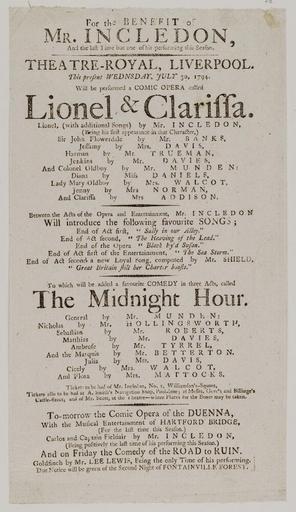 | Keywords: Bodleian Libraries, Playbill of Theatre Royal, Wednesday, July 30, 1794, announcing Lionel & Clarissa &c..jpg Playbill of Theatre Royal Wednesday July 30 1794 announcing Lionel Clarissa c for the benefit of Mr Incledon; Lionel Clarissa; Sally in our alley; Heaving of the lead; Black ey'd Susan; Sea storm; Great Britain still her charter boasts; Midnight hour; Duenna; Hartford Bridge; Road to ruin; Fontainville forest; Playbill of Theatre Royal Wednesday July 30 1794 announcing Lionel Clarissa c single sheet; 316 x 178 mm exhibition history For the benefit of Mr Incledon and the last time but one of his performing this season 011240 object history object type Licensed-PD-Art PD-old-100 cc-by-4 0 place of creation s l England s n place of discovery http //digital bodleian ox ac uk/inquire/p//2a47bc5a-1cb5-4ffb-9f6c-3472e96fd8f9 Digital Bodleian Template John Johnson Playbill of Theatre Royal Wednesday July 30 1794 announcing Lionel Clarissa c Uploaded with GWToolset Bodleian Libraries Playbill of Theatre Royal Wednesday July 30 1794 announcing Lionel Clarissa c http //iiif bodleian ox ac uk/iiif/image/2a47bc5a-1cb5-4ffb-9f6c-3472e96fd8f9/full/ 1000 1000/0/default jpg Files uploaded by the Bodleian Libraries' Wikimedian In Residence Playbills Operas comiques Theatres in Liverpool |