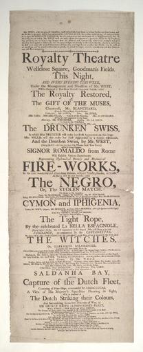 | Keywords: Bodleian Libraries, Poster of the Royalty Theatre 1797, announcing The Royalty restored or The gift of the muses.jpg Poster of the Royalty Theatre 1797 announcing The Royalty restored or The gift of the muses; constant fires have and will continue to be kept in every part of the theatre so that the public may depend on its being throughly aired previous to the opening ; 1797 manuscript ; Royalty restored or The gift of the muses; Drunken Swiss; Hydraulical devices and mechanical fire-works; Negro or The stolen match; Cymon and Iphigenia; Tight rope; Fandango accompanied by the castanettes; Witches or Harlequin Salamander; Saldanha Bay and the capture of the Dutch fleet; Poster of the Royalty Theatre 1797 announcing The Royalty restored or The gift of the muses single sheet; 650 x 246 mm exhibition history Mr West with the greatest submission most respectfully begs leave to inform ladies and gentlemen and the public in general that he has embarked his Little All in the present undertaking of endeavouring to re-open the Royalty Theatre Allegro identifier 20021007/15 29 05 jl object history object type Licensed-PD-Art PD-old-100 cc-by-4 0 place of creation place of discovery http //digital bodleian ox ac uk/inquire/p//79408ba8-3c44-4bd9-a3d3-4e12ed629259 Digital Bodleian Template John Johnson Poster of the Royalty Theatre 1797 announcing The Royalty restored or The gift of the muses Uploaded with GWToolset Bodleian Libraries Poster of the Royalty Theatre 1797 announcing The Royalty restored or The gift of the muses http //iiif bodleian ox ac uk/iiif/image/79408ba8-3c44-4bd9-a3d3-4e12ed629259/full/ 1000 1000/0/default jpg Files uploaded by the Bodleian Libraries' Wikimedian In Residence Theatrical posters Hydraulics Fireworks Fandangos Pantomime musical comedy Tightrope walking |