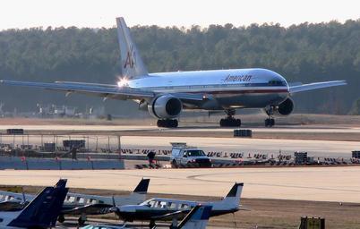 Keywords: American Airlines Boeing 777-200ER airliner touches down runway Raleigh Durham International airport
