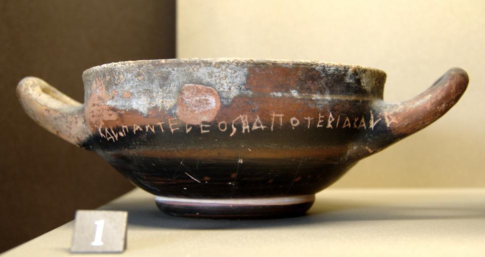 Keywords: Boeotian cup Louvre MNC671.jpg Drinking inscription Boeotian alphabet Black-glaze Boeotian cup 5th century BC From Cynos Livanatas Locris Formule à boire en alphabet béotien Coupe béotienne à vernis noir Ve siècle av J -C Provenance Cynos Livanatas en Locride H 5 70 cm; L 18 90 cm; D 12 40 cm Museum Louvre Department of Greek Etruscan and Roman Antiquities Sully first floor room 39 passage 2 object history credit line Purchase 1884 accession number MNC 671 Bibi Saint-Pol own work 2007-09-09 other versions Boeotian inscriptions Ancient Greek cups Ancient Greek black-glaze pottery Boeotian pottery Greek antiquities in the Louvre - Room 39 5th-century BC pottery Ancient Greek graffiti |