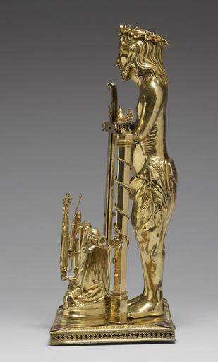 | Keywords: Bohemian - Reliquary with the Man of Sorrows - Walters 57700 - Left.jpg The image of the Man of Sorrows is a distillation of the events of Christ's Passion Christ contemplates with sorrow the instruments of his suffering the cross and hammer whips nails column of the Flagellation and the dice thrown by the soldiers for his garments The gabled container held by an angel once housed a thorn believed to be from Christ's Crown of Thorns while the hinged cross and column probably held pieces of wood believed to be from Christ's cross and from the column against which he was whipped According to an inscription on the base the reliquary was ordered by the bishop of Olomouc in Moravia to house the Holy Thorn It was surely a present for Holy Roman Emperor Charles IV Both men's coats of arms those of Moravia and Bohemia are on the base and the thorn was already in the emperor's famous collection of relics as a gift from the king of France As Charles reigned over both Bohemia and Moravia only from 1347 to 1349 the piece dates to this time The sophisticated workmanship is characteristic of objects created for the imperial court in Prague between 1347 1349 Medieval gilded silver silver champlevé enamel glass paste imitation ruby H 11 5/8 x W at wings 8 3/8 x D 5 in 29 53 x 21 27 x 12 7 cm accession number 57 700 29555 Jacques Seligmann Paris date and mode of acquisition unknown Henry Walters Baltimore June 9 1903 by purchase Walters Art Museum Henry Walters Acquired by Henry Walters 1903 Transcription Majuscule inscription on the pedestal HANC MONSTRANCIAM CUM SPINA CHORONE DOMINI DNS IOHANNES OLOMUCZENSIS EPISCOPUS PREPARARI FECIT Translation John the bishop of Olmütz commissioned this monstrance with the thorn of the crown of Christ The Way to Heaven Relic Veneration in the Middle Ages Museum Catharijneconvent Utrecht; Nieuwe Kerk Amsterdam Amsterdam 2000-2001 The International Style The Arts in Europe Around 1400 The Walters Art Gallery Baltimore 1962 Kaiser Karl IV 1316-1378 Bayerisches Nationalmuseum Munich 1978 Die Parler und der Schöne Stil 1350-1400 Schnütgen-Museum Cologne 1978-1979 Reliquaries and Ritual Medieval Objects of Devotion The Walters Art Gallery Baltimore 1984-1985 Highlights from the Collection The Walters Art Gallery Baltimore 1998-2001 Prague The Crown of Bohemia The Metropolitan Museum of Art New York; Prague Castle Prague 1 2005-2006 Silesia - A Pearl in the Bohemian Crown Three Periods of Flourishing Artistic Relations Waldstein Riding School Prague Prague 2006-2007 Treasures of Heaven The Cleveland Museum of Art Cleveland; The Walters Art Museum Baltimore; The British Museum London 2010-2011 place of origin Prague Czech Republic Walters Art Museum license Bohemian Reliquary with the Man of Sorrows in the Walters Art Museum Medieval reliquaries Bohemia Media contributed by the Walters Art Museum needs category review Media contributed by the Walters Art Museum needs artist review |