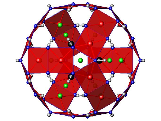 Keywords: Boleite 111 open cage.png en Crystal structure of boleite KPb26Ag9Cu24Cl62 OH 48 Pm-3m viewed along the 111 direction copper cages Black silver atoms red copper atoms green chlorine atoms blue oxygen atoms gray hydrogen atoms own Perditax 2010-08-31 Boleite Crystal structures in space group number 221 |