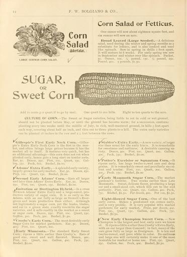 | Keywords: Bolgiano's 1902 catalogue (16162623440).jpg 12 <br> F W BOLGIANO CO <br> Corn <br> Salad <br> Uderfalat <br> LARGE GERMAN CORN SALAD <br> Corn Salad or Fetticus <br> One ounce will sow about eighteen square feet and <br> six ounces will sow an acre <br> Broad Leaved Large Seeded A delicious <br> salad used during the winter and spring months as a <br> substitute for lettuce and is also cooked and used <br> like spinach Sow in spring in drills i foot apart <br> It will mature in 6 weeks For early spring use sow <br> in September and winter over like spinach Packet <br> 5c Ounce ioc pound 15c pound 25c <br> Pound 40c 5 pounds 1 50 <br> SUGAR <br> OR <br> Sweet Corn <br> Add 10 cents p ;r quart if to go by mail One quart to 200 hills Eight to ten quarts to the acre <br> CULTURE OF CORN The Sweet or Sugar varieties being liable to rot in cold or wet ground <br> should not be planted before Ma - or until the ground has become warm ; for a succession continue <br> planting every two weeks until the middle of July in rich well-manured ground in hills 3 feet apart <br> each way covering about half an inch and thin out to three plants to a hill The extra early varieties <br> can be planted 18 inches in the row and 2 ' 2 feet between the rows <br> / <br> w Gillespie's First Early Neck Corn Gilles- <br> pie's Extra Early Neck Corn is the first in the mar- <br> ket and often brings large prices because it has the <br> market all to itself It matures very quick but has <br> an additional advantage this corn does not rot when <br> planted early hence gets a long start on tender sorts <br> Ear 5c Dozen 25c Piut ioc Quart 15c Gal- <br> lon 55c Peck 60c Bushel 2 00 <br> v Adams' Extra Early A splendid early variety <br> largely grown for early market Ear 5c Dozen 25c <br> Pint roc Quart 15c Bushel 2 00 <br> I Second Early Adams' Corn Ears all larger <br> and later than Adams' Extra Early Ear 5c Dozen <br> 25c Pint ioc Quart 15c Bushel 2 00 <br> j Imitation or Burlington Hybrid Is a cross <br> between Adams' Extra Early and a large-eared pro- <br> ductive variety of sugar corn It is as early as the <br> Adams with an ear fully as large as Stowell's Ever- <br> green and more productive than either Although <br> not legitimately a sugar corn yet the husks blades <br> and ear in a green state exactly resemble the sugar <br> varieties and it sells readily in the market as a sweet <br> or sugar corn Dozen 25c Pint ioc Quart 15c <br> Gallon 30c Peck 50c Bushel 1 50 <br> v Crosby's Early Corn - The most desirable early <br> Sugar Corn for market gardeners Ear 5c Dozen <br> 40c Pint ioc Quart 20c <br> ' Early Minnesota The standard Early Sweet <br> Corn; ripens a little earlier than Crosby's Ears of <br> good size sweet and well flavored Dozen 40c <br> Pint ioc Quart 20c Gallon 40c Peck 75c <br> Bushel 2 00 <br> I Stabler's Extra Early A new variety of larger <br> size than usual for the early kin- is It is remarkable <br> for sweetness and earliness A desirable canning va- <br> riety Dozen 40c Pint ioc Quart 20c Gallon <br> 40c Peck 75c Bushel 2 00 <br> I lยป <br> 'otter's Excelsior or Squantam torn It <br> ripens early has large twelve-rowed ears and deep <br> grains It is remarkably sweet and peculiarly succu- <br> lent and tender Pint ioc Quart 20c Gallon <br> 40c Peck 75c Bushel 2 00 <br> ขยฃ <br> Early Mammoth Sugar Corn The market <br> gardener's favorite Two weeks earlier than Late <br> Mammoth Sweet delicate flavor producing a large <br> ear and a small-sized cob which fills out to the end <br> perfectly Pint ioc Quart 15c Gallon 40c Peck <br> 75c Bushel 2 50 Per dozen 40c Per 100 2 50 <br> Eight- Rowed Sugar Corn One of the best <br> early corns Makes a good-sized ear comes early <br> and is very prolific It is very popular with market <br> gardeners for early market Price per dozen 40c <br> Pint ioc Quart 15c Gallon 40c Peck 75c <br> Bushel 2 50 <br> /Xew Early Champion Sweet Corn New <br> Champion is the largest and best early corn we know <br> of It ripens a little earlier than Crosby's Extra Early <br> with an ear larger than Concord ; in fact many of the <br> ears grow fully as large as Evergreen It is ten and <br> twelve-rowed and pure white in color Its earliness <br> and large size will certainly make it one of the most <br> desirable for market or home use Pint 15c Quart <br> 25c Gallon 60c Peck 90c Bushel 2 50 42156262 132756 65911 Page 12 Text http //www biodiversitylibrary org/page/42156262 1902 10 5962/bhl title 65911 F W Bolgiano Co ; Henry G Gilbert Nursery and Seed Trade Catalog Collection Biodiversity Heritage Library Bolgiano's 1902 catalogue tested seeds for the garden and farm Garden Stories Bulbs Plants Catalogs Fruit Garden tools Nurseries Horticulture Seeds Vegetables U S Department of Agriculture National Agricultural Library bhl page 42156262 dc identifier http //biodiversitylibrary org/page/42156262 bhlGardenStories BHLinbloom bulbs plants nurseries horticulture u s department of agriculture national agricultural library bhlgardenstories bhlinbloom Information field Flickr posted date ISOdate 2015-01-23 Check categories 2015 August 24 CC-BY-2 0 BioDivLibrary https //flickr com/photos/61021753 N02/16162623440 2015-08-24 08 54 15 cc-by-2 0 PD-old-70-1923 Bolgiano's 1902 catalogue Photos uploaded from Flickr by Fรฆ using a script |