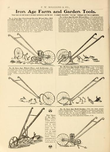| Keywords: Bolgiano's 1902 catalogue (16324075106).jpg 38 <br> F W BOLGIANO CO <br> Iron Age Farm and Garden Tools <br> These tools are well known to be most satisfactory and the best <br> No 6 Iron Age Combined Double Wheel Hoe Hill <br> and Drill Seeder Ease and simplicity of adjustment <br> lu uiness combined with great strength accuracy in dis- <br> tributing the seed and ease of operation are striking and <br> important features of this most practical and complete <br> Combination Tool In each form whether a Seed Drill <br> Douole Wheel Hoe or single Wheel Hoe it is equal to tools <br> made especially for the one purpose It places the seed in <br> continuous rows or in hills at 4 6 8 12 or 21 inches apart <br> Complete as in cut price 10 The Double Wheel Hoe <br> form of this tool is shown as No 1 opposite <br> A complete descriptive Iron Age Catalogue sent free on application <br> No 1 Iron Age Double Wheel Hoe One great advan- <br> tage of this tool is that it can be changed to a practical Sin- <br> gle Wheel Hoe in a moment's time The wheels of these <br> tools are hi inches high enabling them to run easily and <br> without yielding to the inequalities of the soil as a low <br> wheel will do The frame being made of pipe coupled to <br> malleable castings gives great strength together with <br> lightness A set of ploughs cultivator teeth and rakes ac- <br> company this tool Price complete 6 00 A Seed Drill at- <br> tachment may be applied for sowing in rows only 00 or <br> sowing in both rows and hills 1 00 As No 8 Double Wheel <br> Hoe side hoes only 3 50 <br> No 12 Iron Age Wheel Plow and Cultivator Re- <br> markable for its exceeding lightness combined with great <br> strength low price and variety of satisfactory work it will <br> accomplish Can be used as a Plow Hoe Cultivator or <br> Hake Price complete 8 00 As wheel plow only No 11 <br> 2 00 <br> No 20 Iron Age Single Wheel Hoe One of the latest <br> and most complete Single Wheel Hoes made It is light <br> but very strong Furnished with 1 pair of side hoes 3 cul- <br> tivator teeth 1 pair of rakes and a landside plow Price <br> complete 5 00 Price plain hoes only No 21 8 25 Can <br> be changed to a Hili or Drill Seeder by applying the seeder <br> attachment <br> The Gem <br> of the Gar- <br> den -Single <br> Wheel Hoe <br> Very popular <br> and is well <br> known for <br> years to be <br> truly a Gem <br> Can be used <br> as a Hoe Cul- <br> tivator or <br> Plow Price <br> complete 4 25 <br> Plain with <br> teeth only 8 <br> No 18 Iron Age Drill Seeder Has the high wheel <br> index adjustment the brush agitator and every good feat- <br> j ure of a plain drill Price complete 6 00 The hoe attach- <br> / ment of the No 20 may be added at any time making a <br> ~ complete Plow Cultivator or Rake <br> No 16 Iron Age Hill and Drill Seeder 7 00 42156288 132756 65911 Page 38 Text http //www biodiversitylibrary org/page/42156288 1902 10 5962/bhl title 65911 F W Bolgiano Co ; Henry G Gilbert Nursery and Seed Trade Catalog Collection Biodiversity Heritage Library Bolgiano's 1902 catalogue tested seeds for the garden and farm Garden Stories Bulbs Plants Catalogs Fruit Garden tools Nurseries Horticulture Seeds Vegetables U S Department of Agriculture National Agricultural Library bhl page 42156288 dc identifier http //biodiversitylibrary org/page/42156288 bhlGardenStories BHLinbloom bulbs plants nurseries horticulture u s department of agriculture national agricultural library bhlgardenstories bhlinbloom Information field Flickr posted date ISOdate 2015-01-23 Check categories 2015 August 24 CC-BY-2 0 BioDivLibrary https //flickr com/photos/61021753 N02/16324075106 2015-08-24 08 53 32 cc-by-2 0 PD-old-70-1923 Bolgiano's 1902 catalogue Photos uploaded from Flickr by FĂŚ using a script |