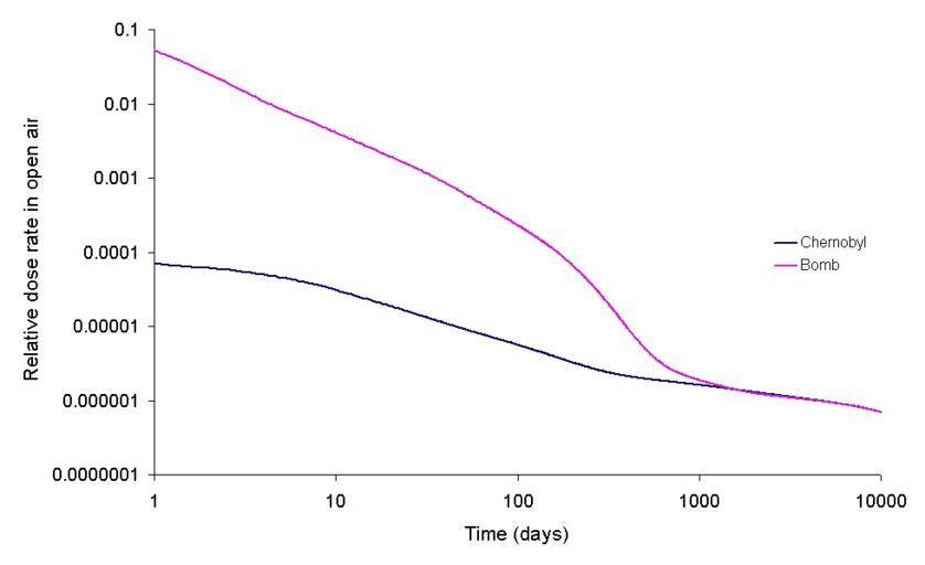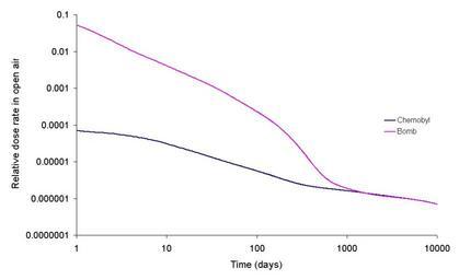 | Keywords: Bombvschernobyldoserateinopenair.png This is a graph drawn using data calculated using a method similar to that of T Imanaka S Fukutani M Yamamoto A Sakaguchi and M Hoshi J Radiation Research 2006 47 Suppl A121-A127 for calculating the dose due to the bomb fall out which calculated for a surface burst with no separation of the different isotopes <sup>131</sup>I <sup>133</sup>I <sup>132</sup>Te <sup>133</sup>I <sup>135</sup>I <sup>140</sup>Ba <sup>95</sup>Zr <sup>97</sup>Zr <sup>99</sup>Mo <sup>99m</sup>Tc <sup>103</sup>Ru <sup>105</sup>Ru <sup>106</sup>Ru <sup>142</sup>La <sup>143</sup>Ce <sup>137</sup>Cs <sup>91</sup>Y <sup>91</sup>Sr <sup>92</sup>Sr <sup>128</sup>Sb and <sup>129</sup>Sb are the gamma emitters which have been conisdered for the bomb fallout The fission was assumed to have been caused by 1 MeV neutrons and 20 occurred in the <sup>238</sup>U tamper of the bomb the dose does not include the effect of any shielding The data was from the Korean table of the isotopes For the chernobyl fallout The contributions made by the different isotopes to the dose in air caused in the contaminated area in the time shortly after the accident Note that this image was drawn using data from the OECD report the Korean table of the isotopes and the second edition of 'The radiochemical manual' Data on the release was taken from the following two sources It was assumed that the whole release occurred on the first day in an instant A short report on the release of radioisotopes from the site is on the OSTI web site<ref>http //www osti gov/energycitations/product biblio jsp osti_id 5087075 Chernobyl source term atmospheric dispersion and dose estimation EnergyCitationsDatabase November 1 1989</ref> A more detailed report can be downloaded from the OECD web site's public library<ref>http //hermia sourceoecd org/nw 1/rpsv/~4292/v3n1/s1/p1l OECD Papers Volume 3 Issue 1 OECD 2003</ref> as a 1 85MB PDF file <references/> See the graphs on the trinity glass in J Environmental Radioactivity w Image Bombvschernobyldoserateinopenair jpg 2006-07-22 wikipedia en user Cadmium en wikipedia Cadmium w Image Bombvschernobyldoserateinopenair jpg Nuclear fallout Chernobyl disaster Diagrams by user Cadmium |