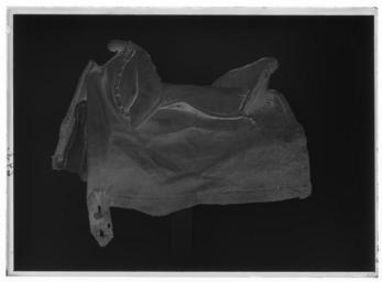 | Keywords: Bomsadel - Livrustkammaren - 69199-negative.tif LSH artwork sv Bomsadel av svärtat läder sitsen med rester av stickningar Rektangulära sadelkappor medstickad kantmarkering fodrad med vitt läder På kappans högra sida finns baktill en påsyddläderficka med lock av svärtat läder fäst med vit läderstropp På vänstra sidan framtillen läderstropp <br/>Frambom ca 450 mm bred 100 mm hög tvådelad med tvär avslutning Hög rundad bakbom ca340 mm bred 110 mm hög med rest av stickning Räfflad avlång sadelknapp av mässing framtill rundad På frambommens högra sida fyra mässingstennlickor på vänstra sidan 6mässingstennlickor <br/>Vid bakbommen 10 mässingstennlickor Bossor av linne kantad med vitt läder Bommen kläddmed linne 2 byglar av stål för stigläder 4 stroppar av dubbelt brunt läder försadelgjord <br/>På bommens framvalv finns en läderögla På bommens bakvalv finns en stålsölja för svansrem original caption leather Färg vit material läder - brass - linen - steel - leather Färg brun material läder size mm 570 size mm 300 sits LRK Axel Oxenstierna af Södermöre place of origin original filename LN_B04258_007138 43788 inventory number LRK 7191 69199 CC0 Bomsadel - Livrustkammaren - 69199 tif |