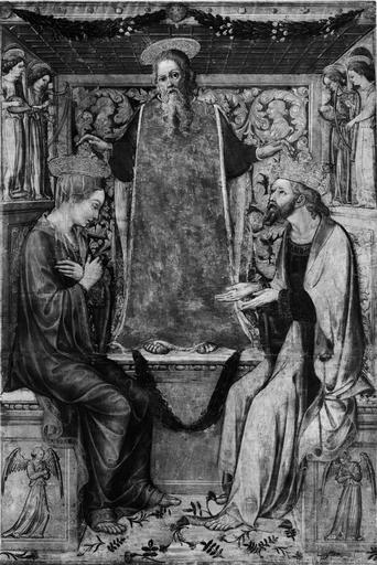 | Keywords: Bonifacio-bembo-cornation-christ-virgin-museo-civico-ala-ponzone-1467.jpg en Oil on panel depiction of the coronation of Christ and the Virgin by God the Father from an altarpiece for the chapel of Sant'Agostino in Cremona The figures are also thought to represent Saints Daria and Grisante The altarpiece was commissioned by the Ducal family of Milan and commemorated the saints' feast day of October 25 which was also the anniversary of Francesco Sforza and Bianca Maria Visconti married in 1441 The panel currently resides in the Museo Civico Ala Ponzone in Cremona The Frick Collection http //images frick org/PORTAL/IMAGEINFO php file /Volumes/Photoarchive/Negatives/25774_25960/25856_POST tif Creator Bonifacio Bembo 1467 PD-old-100 <gallery>Bembo-cornation-christ-virgin-museo-civico-ala-ponzone-1467 jpg</gallery> 15th-century paintings of Coronation of Mary Bonifacio Bembo Sant'Agostino Cremona Altar paintings |