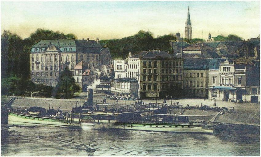 Keywords: Bonn Rheinufer Rheinbrücke 1907.jpg Blick von der Rheinbrücke auf das Rheinufer Bonn; in der Mitte das Hotel Rheineck Stadtarchiv Bonn Postkartensammlung original source <br />Heijo Klein Ansichten vom Bonner Rheinufer In Bonner Heimat- und Geschichtsverein Stadtarchiv Bonn Hrsg Bonner Geschichtsblätter Jahrbuch des Bonner Heimat- und Geschichtsvereins Band 57/58 Bonn 2008 ISSN 0068-0052 S 74 1907 author PD-old Brassertufer Bonn in the 1900s |