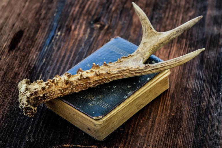 Keywords: book old book antique antler wood wooden table close