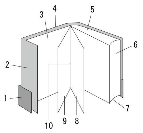 | Keywords: Bookinfo.svg の構 Diagram of a book Belly band Flap Endpaper Book cover Top edge Fore edge Tail edge Right page recto Left page verso Gutter 2006-12-16 Own Lemon-s Bookbinding illustrations Diagrams labelled with numbers only Fore-edges Symbols of books ono |