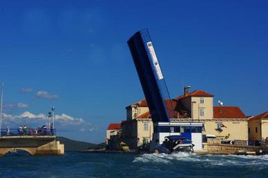 Keywords: boot bridge transit port croatia shipping lane sea route passage channel high bridge bow wave photo tisno ship shipping road sea holiday