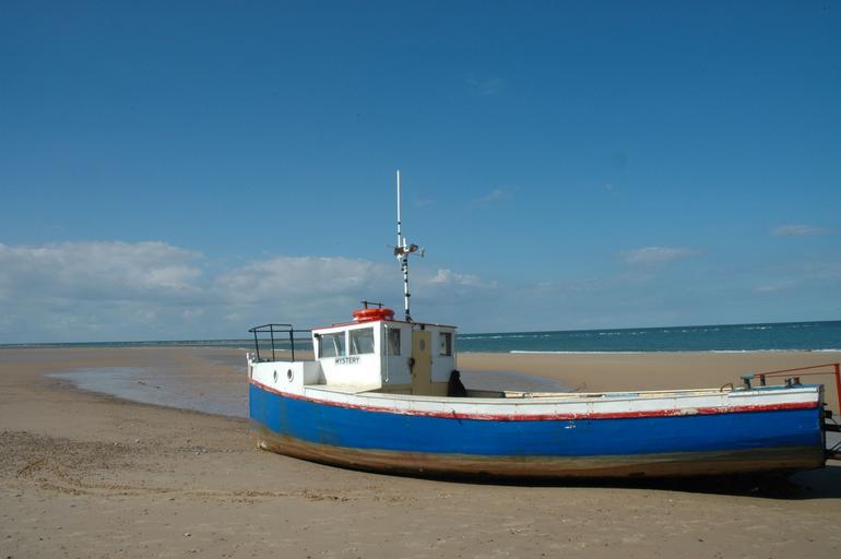 Keywords: boot fishing boat sea beach blue mystery sky ebb