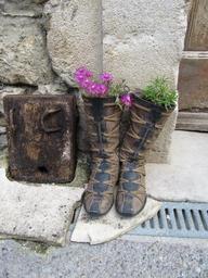 Keywords: boots flowers plants stones wall block wood lilac purple