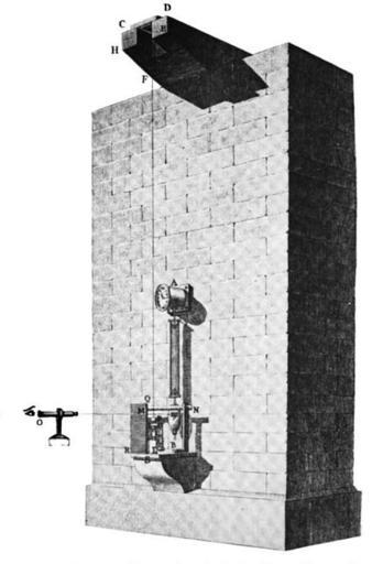 Keywords: Borda and Cassini pendulum experiment.png Drawing of pendulum experiment to determine the length of the seconds pendulum at Paris conducted in 1792 by Jean-Charles de Borda and Jean-Dominique Cassini From their original paper They used a pendulum that consisted of a 1 1/2 inch 3 8 cm platinum ball suspended by a 12 foot 3 97 m iron wire F Q It was suspended in front of the pendulum B of a precision clock A Alterations to image moved observer O closer to wall to reduce unwieldy size of image converted to PNG Image shows aliasing artifacts crosshatching from scanning of original halftone image Downloaded 2009-01-27 from http //books google com/books id A1IqAAAAMAAJ pg RA2-PA317 Victor F Lenzen Robert P Multauf 1964 'Paper 44 Development of gravity pendulums in the 19th century' in United States National Museum Bulletin 240 Contributions from the Museum of History and Technology reprinted in Bulletin of the Smithsonian Institution 1964 Smithsonian Institution Press USA p 317 fig 13 on Google Books Image credited in text to J C Borda and J D Cassini de Thury 'Experiénces pour connaitre la longuer de pendule qui bat les secondes à Paris' in Collection de Mémoires Relatifs a la Physique publiés par la Société Française de Physique Vol 4 Mémoires sur le pedule précédés d'une bibliographie Gauthier-Villars Paris 1889 Plate 2 1889 Jean-Charles de Borda and Jean-Dominique Cassini Public domain - Borda died in 1799 Cassini in 1845 PD-old Pendulums Gravimetry Jean-Charles de Borda Giovanni Cassini |