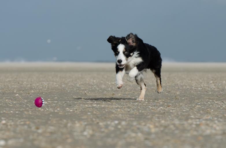 Keywords: border collie dog runs after ball with ball young dog beach playful play fun dog ball game british sheepdog young border collie