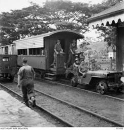 Keywords: BORNEO, JEEP TRAIN LEAVES BEAUFORT TO MEMBAKUT.JPG en BEAUFORT BORNEO 20 JULY 1945 MEMBERS OF HEADQUARTERS 24TH INFANTRY BRIGADE OPERATING THE JEEP TRAIN WHICH IS LEAVING THE LOCAL RAILWAY STATION FOR THE JOURNEY TO MEMBAKUT 1945-07-20 111835 unknown photographer other versions Custom license marker 2015 08 27 PD-Australia Uploaded with UploadWizard Borneo Rail Jeep |