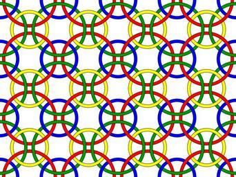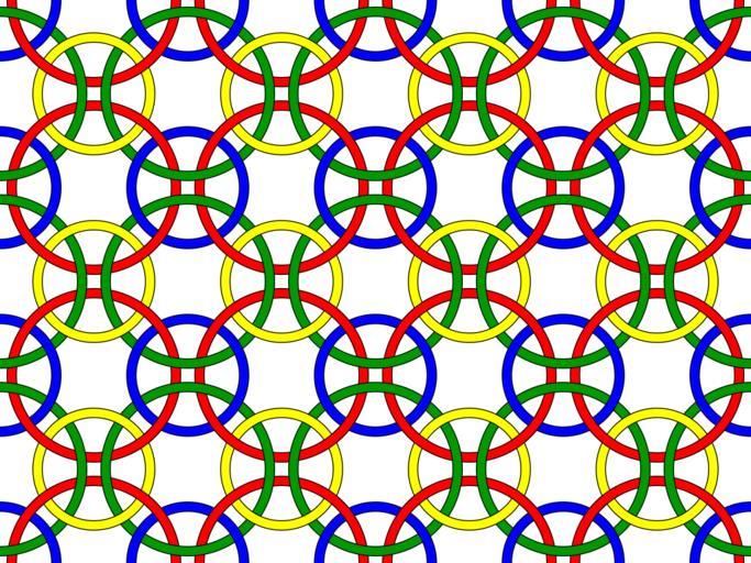 Keywords: Borromean-chainmail-tile.svg Borromean chain-mail -- an indefinitely extended pattern in which each small circle is part of four Borromean rings configurations and each large circle is part of eight Borromean rings configurations so that every area contained within circles of three different colors is at the center of a Borromean rings configuration and no two circles are directly linked To free a yellow or blue loop two red loops or two green loops must be cut To free a red or green loop four other loops must be cut Borromean-chainmail-tile png 2010-01-18 03 12 UTC Borromean-chainmail-tile png AnonMoos derivative work McSush <span class signature-talk >talk</span> Other fields + RetouchedPicture redrawn as svg image McSush Borromean-chainmail-tile png Backdrop tiles Circular Borromean rings Knots in art and decoration Linked circle patterns Outline knots and links